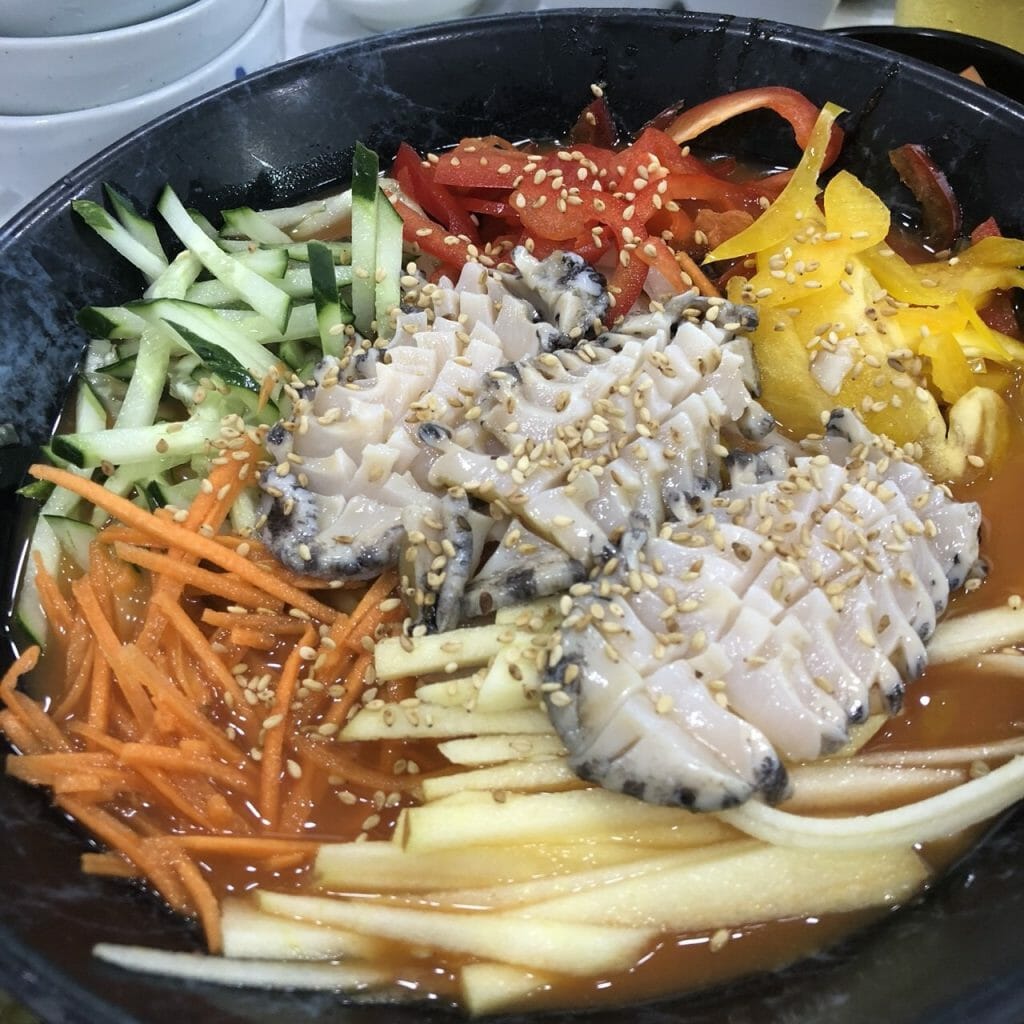鮑のお刺身と野菜たっぷりのムルフェ물회